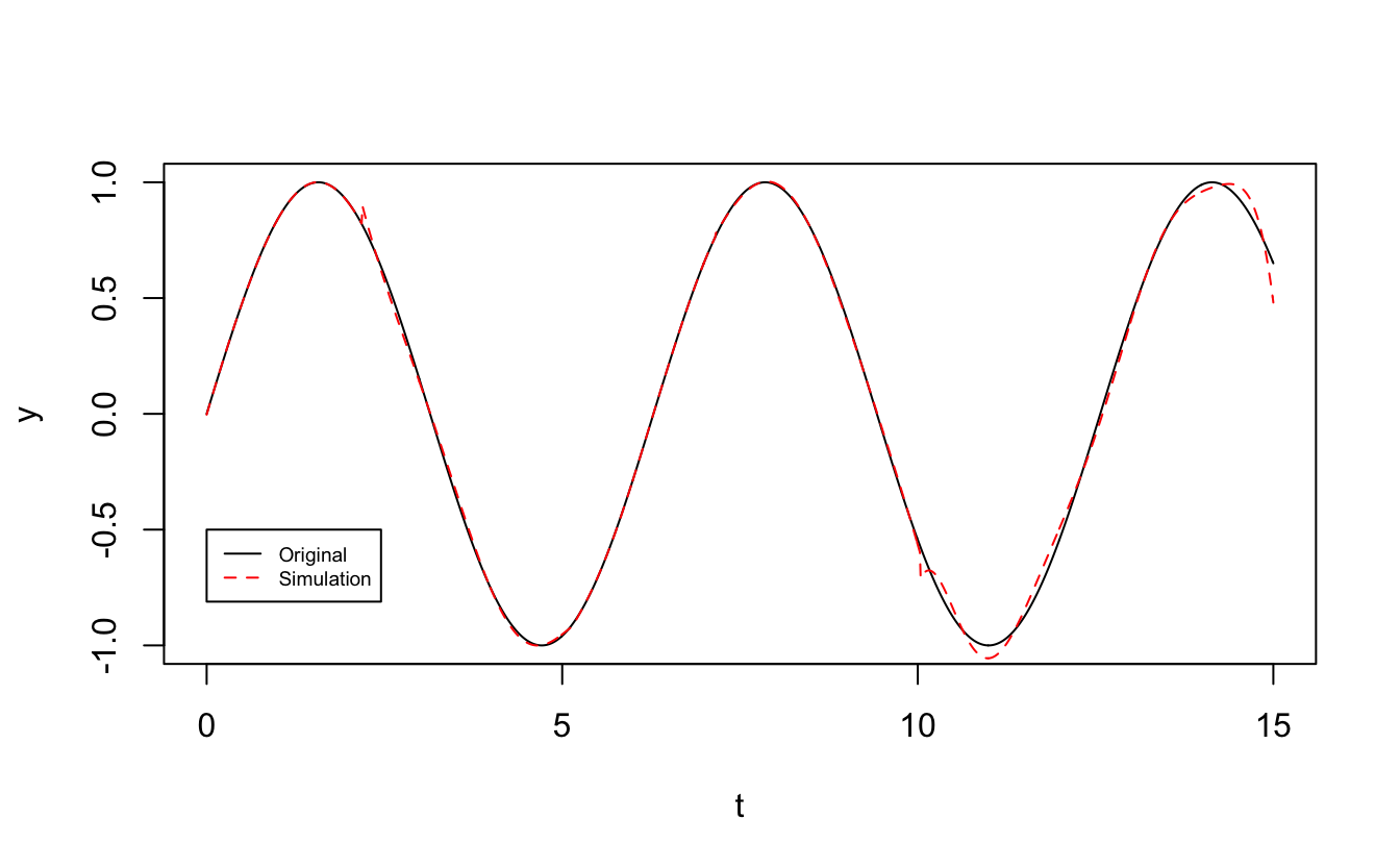 legend(-1, 1, c('Original', 'Simulation'), col = c(1,2), lty = c(1,2), cex = 0.8)